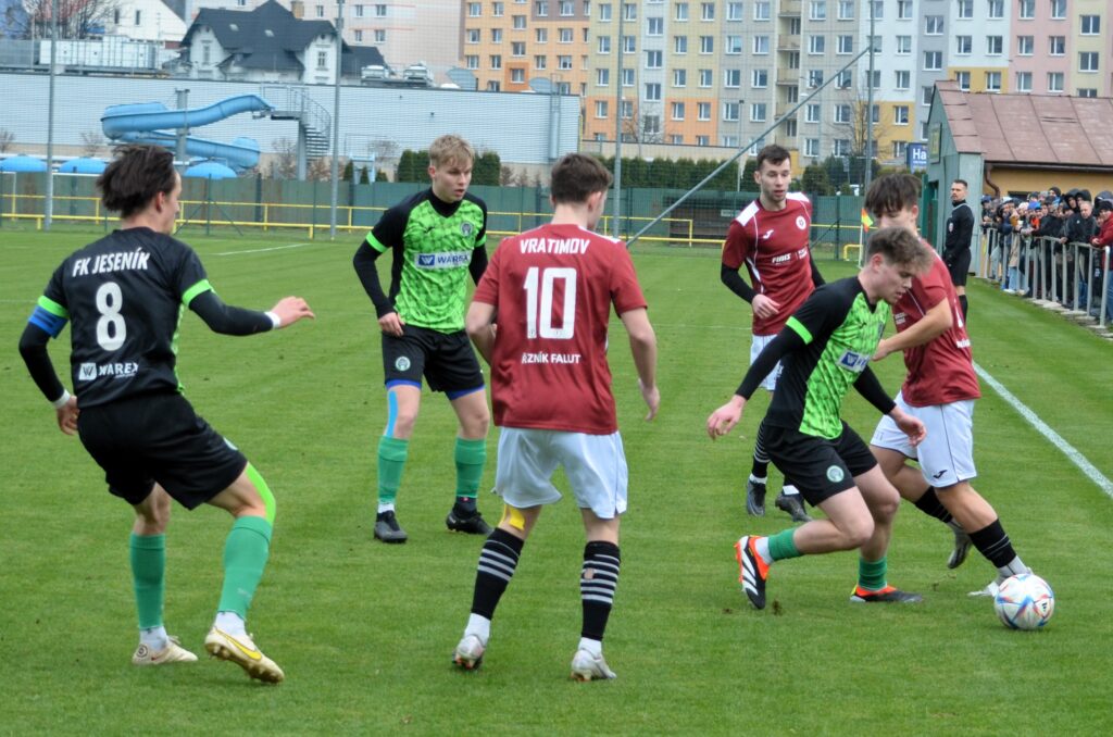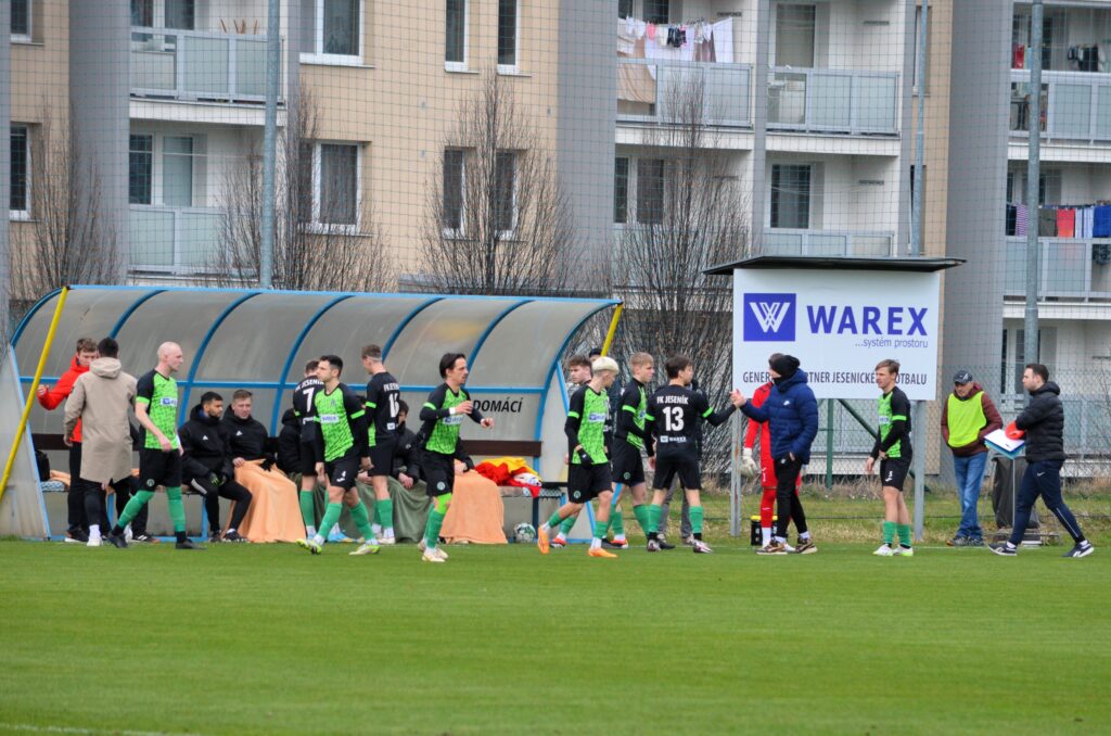 V druhé půli hosté zvýšili aktivitu, na což ale Jeseník dobře zareagoval a na obou stranách se zrodilo několik nebezpečných situací. My jsme byli blízkou gólu, když se Michal Bráblík na zadní tyči marně natahoval po stříleném centru a chyběly centimetry. Ve velké šanci se ocitl Planý, kterého vychytal včasným vyběhnutím brankář Střalka.
