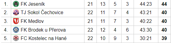 Dramatické a vyrovnané je čelo krajské tabulky, ve které má Jeseník momentálně čtyřbodový náskok, ale poté následují čtyři týmy s rozdílem jediného bodu. Už zítra nás čeká domácí zápas s Čechovicemi a půjde tedy o střetnutí prvního s druhým. Zároveň je to utkání dvou mužstev, které v jarní části ještě neprohrály.