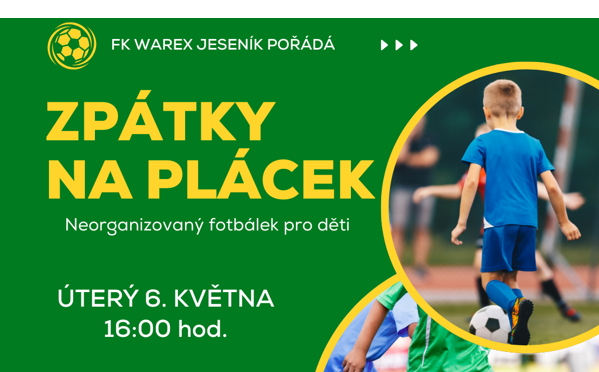 FK WAREX JESENÍK spouští od května projekt “ZPÁTKY NA PLÁCEK”. Jedná se o pravidelné “tréninkové jednotky”, které se svojí (ne)organizací přiblíží časům Nedvědů, Rosických, Šmicerů aj., kteří se své fotbalové umění učili na “plácku” za domem.
